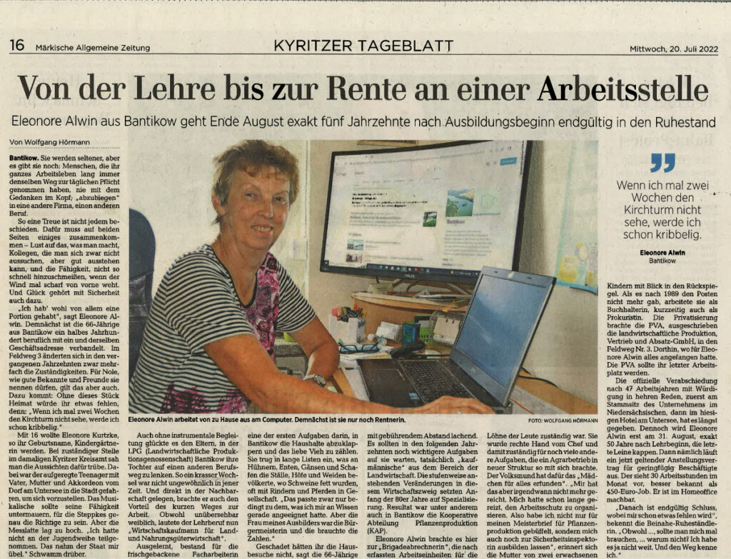 Eleonore Alwin aus Bantikow geht Ende August exkt fünf Jahrzehnte nach Ausbildungsbeginn endgültig in den Ruhestand.